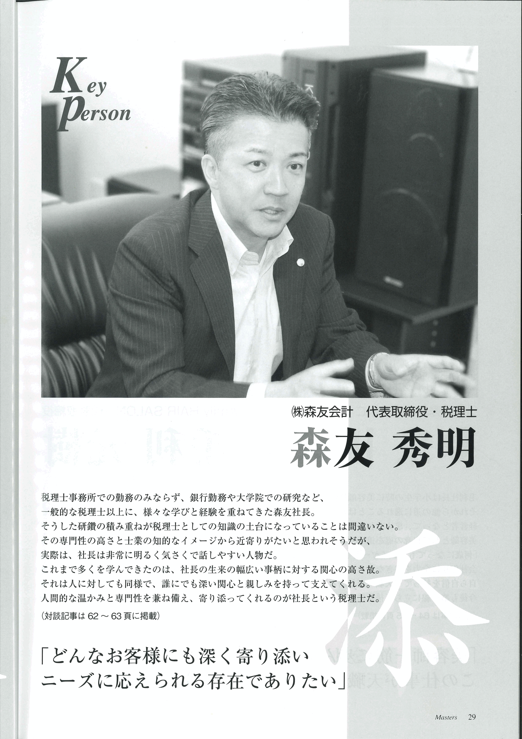 当事務所は、会社経営者様・個人事業主様の最良のパートナーとして、また地域の方々の相続税・贈与税などの資産税に関するアドバイスを行う税理士事務所として、ご相談頂いた一つ一つの案件に丁寧に向き合いながら目の前の事案に全力で取り組んでいけるよう日々研鑽しております。